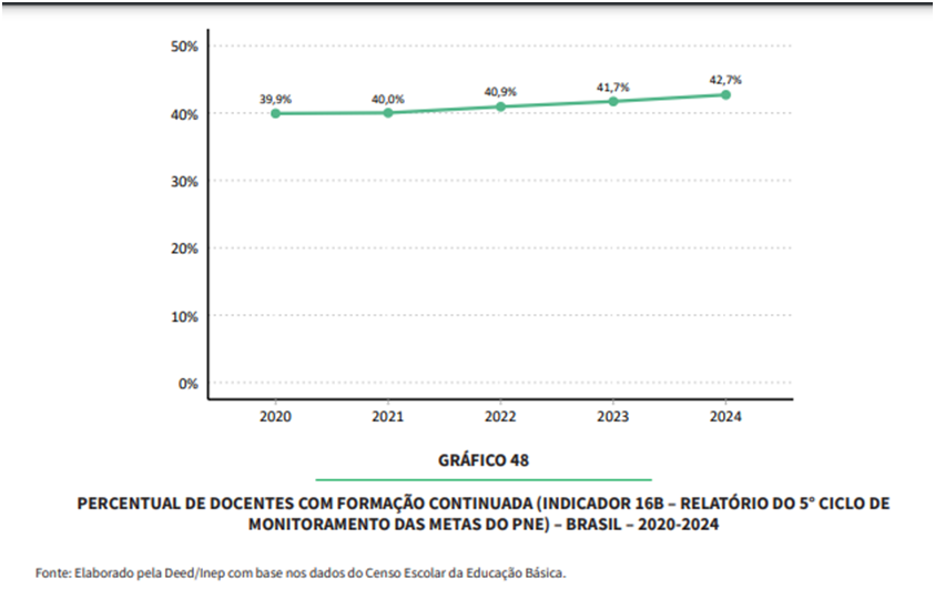 Ainda segundo o relatório, também houve aumento no percentual de professores com acesso a formação continuada, passando de 39,9% para 42,7%, entre os anos de 2020/2024, conforme demonstrado a seguir: